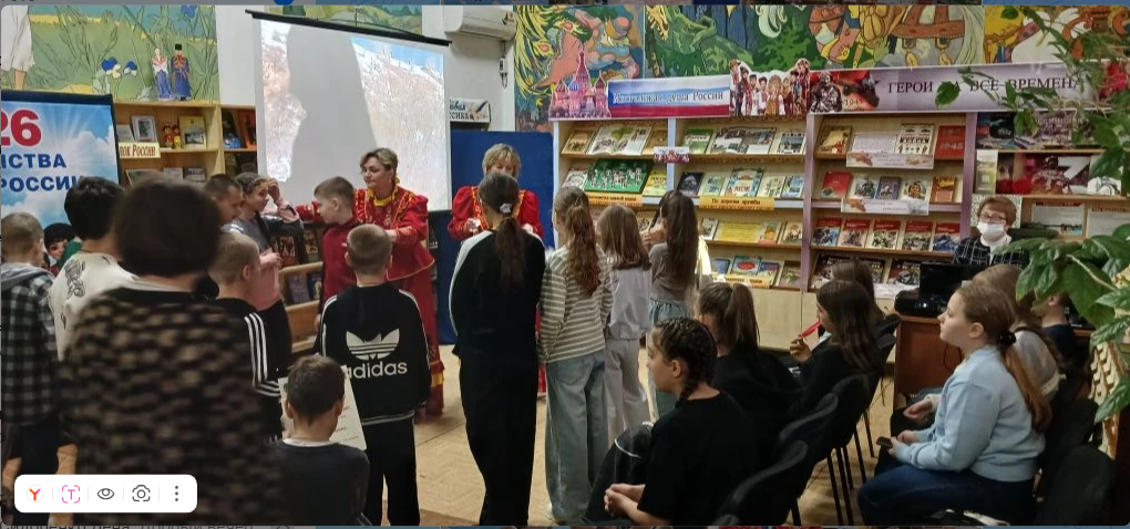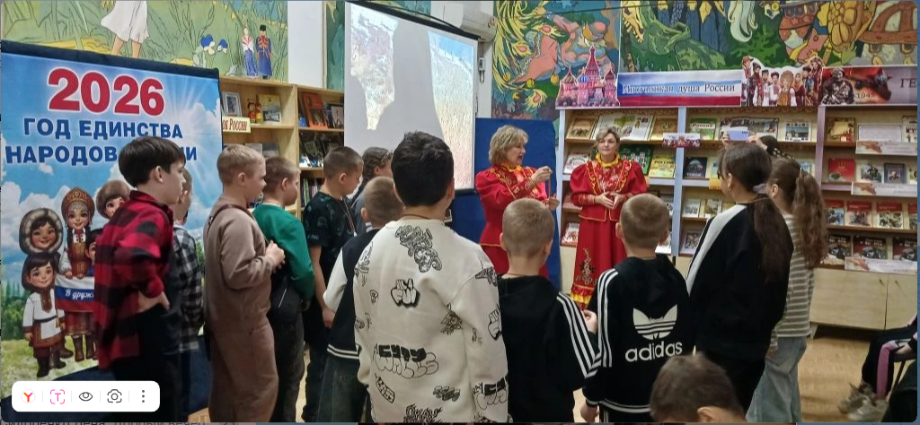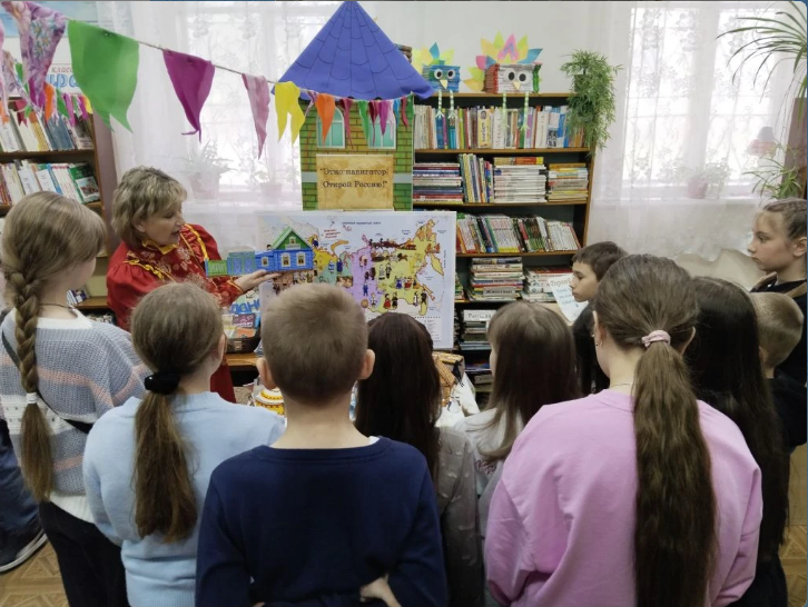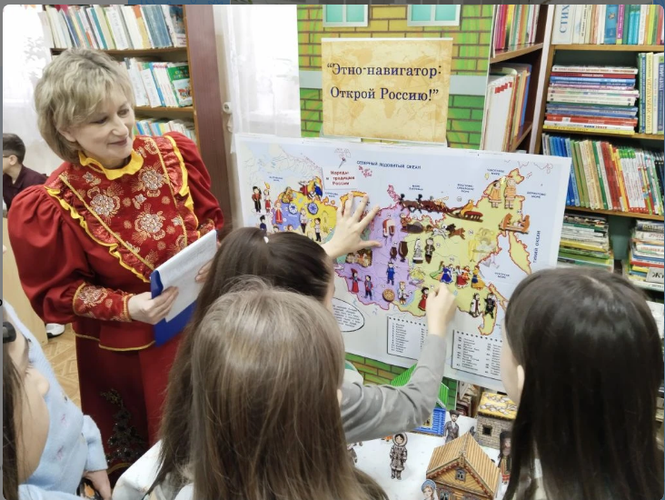 На абонементе работал этно – навигатор «Открой Россию!». Большая физическая карта России прикреплена к стеллажу. Рядом располагались конверты с миниатюрными символами народов (вырезанные изображения: матрешка, чум, лезгинка, калмыцкая кибитка и т.д.). Читатели прикрепляли символ к тому региону, с которым он ассоциируется. Это вызвало дискуссию, вопросы и стало поводом для консультации с библиотекарем. Юные посетители знакомились с народными традициями, отметили на карте место проживания разных народов нашей страны
