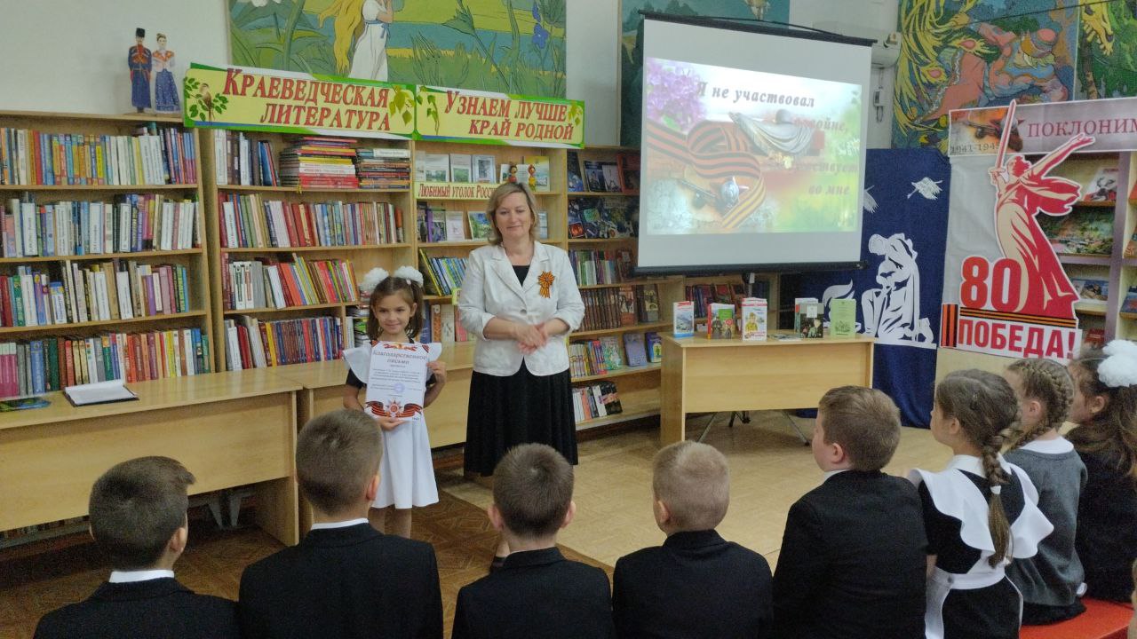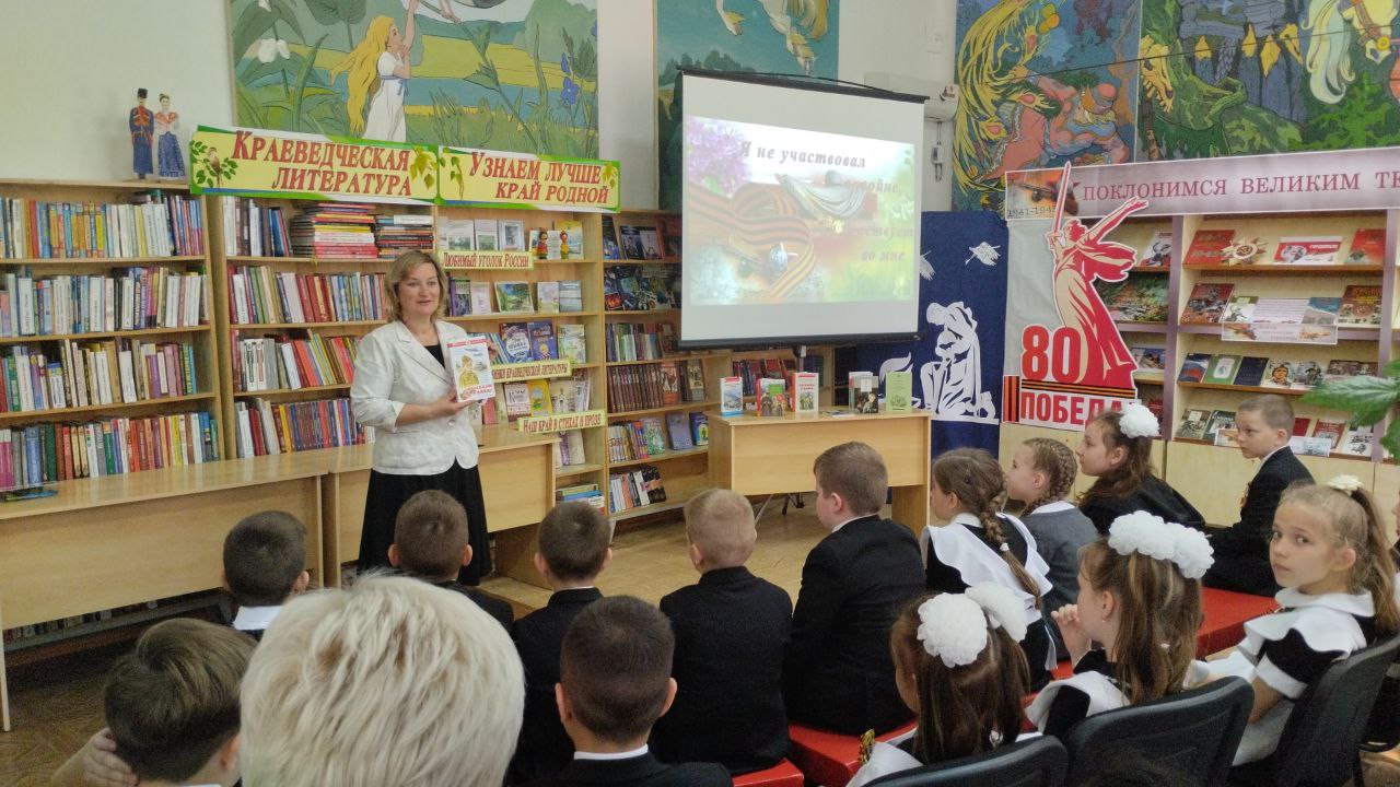 «Я не участвовал в войне – она участвует во мне…» - эти поэтические строчки Юрия Левитанского стали названием мероприятия, на которое Новопокровская детская библиотека пригласила учащихся 3 «Б» класса МБОУ СОШ №1. Сотрудники библиотеки познакомили ребят с замечательными стихами писателей-фронтовиков, которым пришлось пройти дорогами военного лихолетья, создавая поэтическую летопись Великой Отечественной войны. Стихи военных лет звучали буквально с первого и до последнего дня войны. Ребята слушали, затаив дыхание, словно страницы книг с историями о подвигах оживали прямо перед ними.