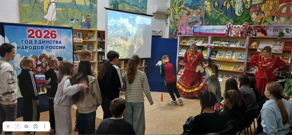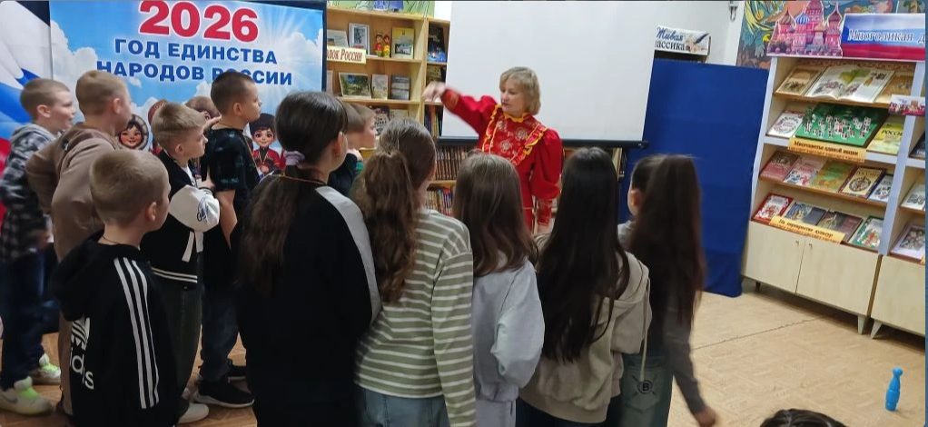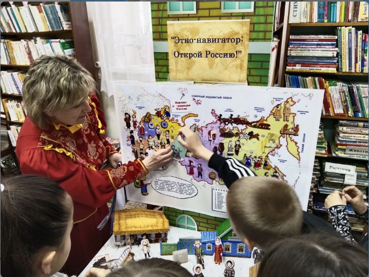 На абонементе работал этно – навигатор «Открой Россию!». Большая физическая карта России прикреплена к стеллажу. Рядом располагались конверты с миниатюрными символами народов (вырезанные изображения: матрешка, чум, лезгинка, калмыцкая кибитка и т.д.). Читатели прикрепляли символ к тому региону, с которым он ассоциируется. Это вызвало дискуссию, вопросы и стало поводом для консультации с библиотекарем. Юные посетители знакомились с народными традициями, отметили на карте место проживания разных народов нашей страны