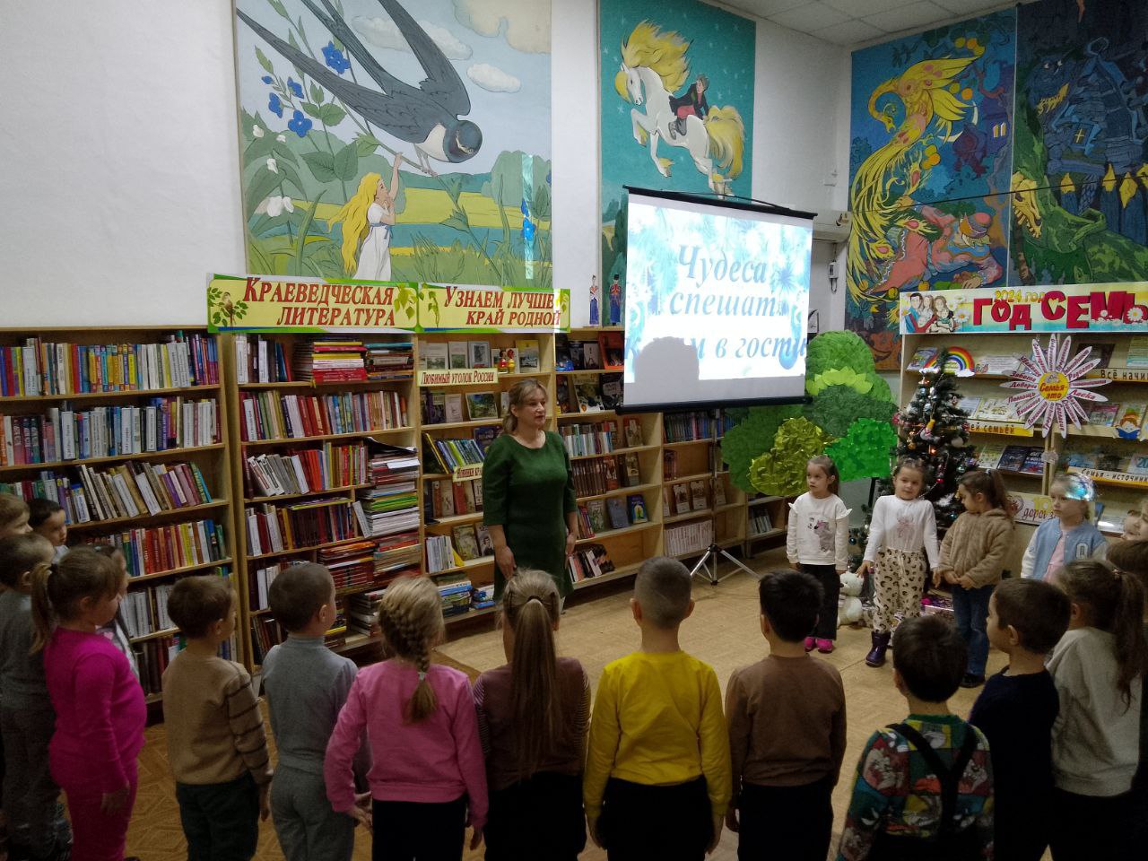 Новопокровская детская библиотека пригласила воспитанников МБДОУ № 42 на новогоднее мероприятие «Чудеса спешат к нам в гости», где ребят ждала весёлая игровая программа. Всем известно, что Новый год невозможен без одного из самых важных атрибутов праздника - ёлочки. Но, на этот раз ёлка капризничала и не хотела зажигать свои огоньки. Тогда дети решили порадовать лесную красавицу и рассказали для неё стихотворения и спели новогодние песенки. И чудо случилось - ёлка зажгла огни! Ещё долго в библиотеке звучал детский смех и царило веселье!