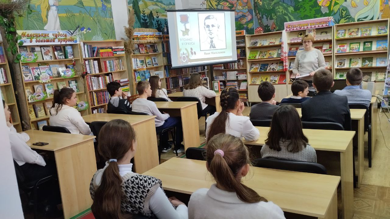 Учащимся 7 «А» класса МБОУ СОШ №1 Новопокровская детская библиотека предложила медиа – презентацию «Мы родом не из детства – из войны», из которой школьники узнали о пионерах Кубани, отдавших свои жизни во имя Победы над фашизмом. В видеоряде, сопровождавшем рассказ библиотекаря, были представлены фотографии юных героев Великой Отечественной войны. Сотни ребят сражались в партизанских отрядах, были членами подпольных организаций, они были разведчиками и связистами, сестрами милосердия и подрывниками. Слушая о подвигах своих сверстников, подростки внимательно вглядывались в кадры документальной хроники тех далеких пылающих лет, сохранившие для потомков лица юных патриотов.