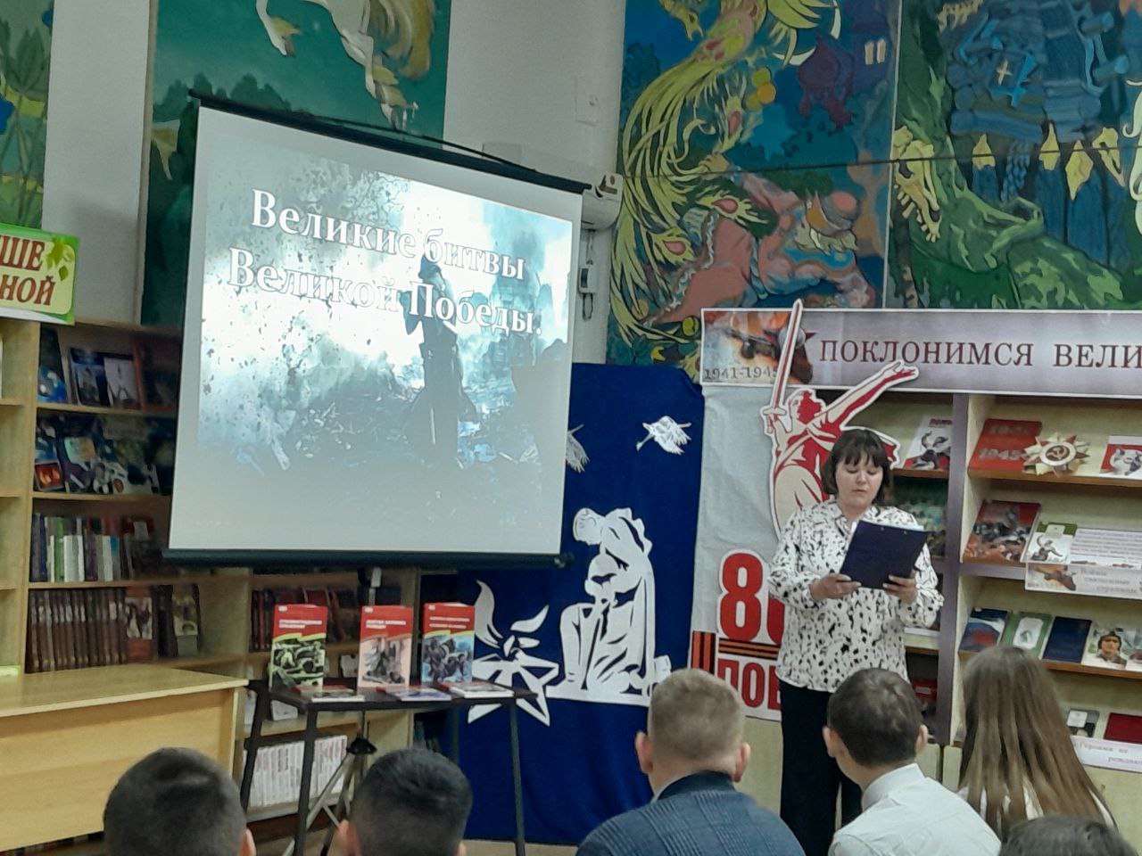 15 мая Новопокровская детская библиотека для учащихся 5 «А» класса МБОУ СОШ №1 провела урок мужества «Великие битвы Великой Победы». Ребята познакомились с книгами, рассказывающими о битве за Москву - первом крупном поражении фашистских войск; Сталинградской битве - переломном моменте в войне; Курской дуге – сокрушительномударе по наступательным возможностям врага и др. Школьники высказывали свое мнение о том, почему важно знать историю страны и помнить о подвигах солдат,совершённых в годы Великой Отечественной войны.